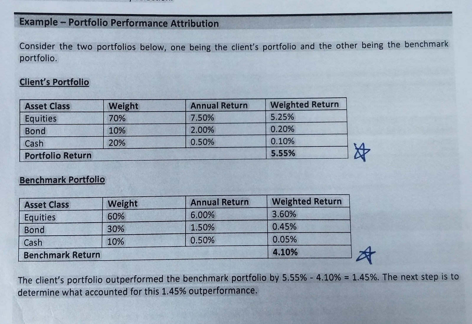 You are almost guaranteed to be asked whether the client’s portfolio outperformed or underperformed the benchmark.